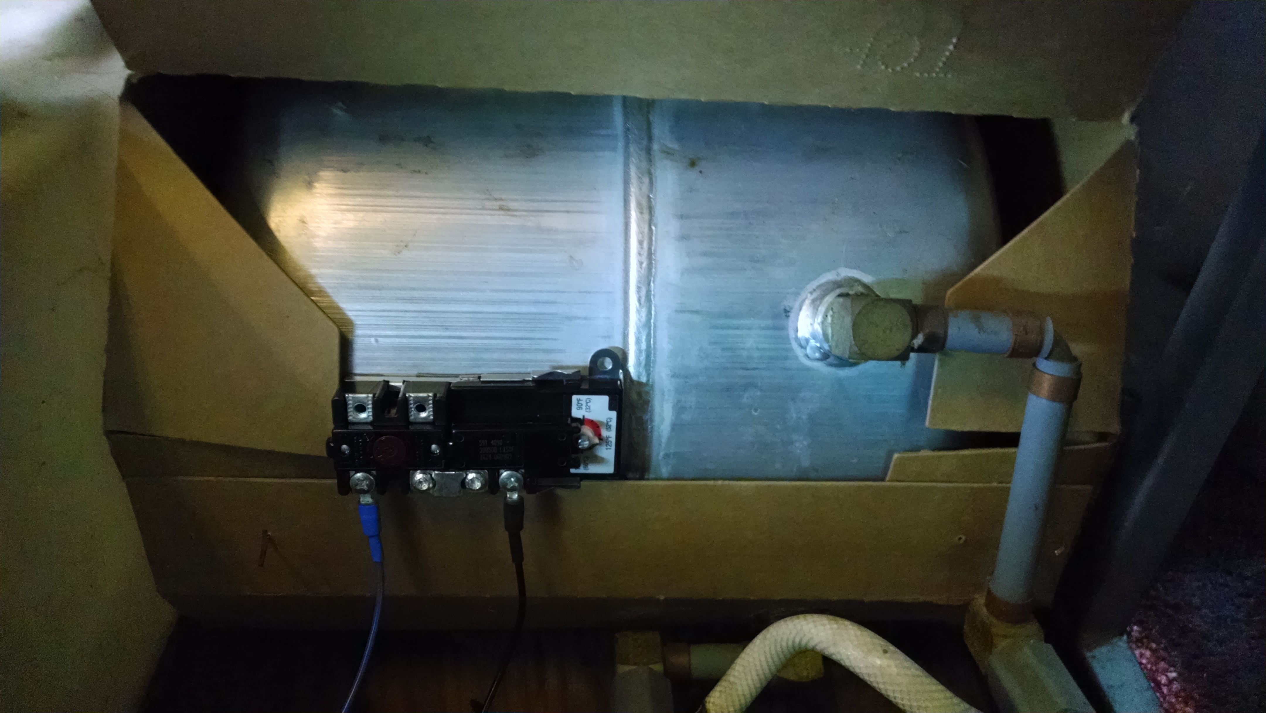 Just a matter of extending the three heater control wires, by using a piece of heavy duty extension cord and crimp on connectors so everything simply plugs together. Then vertically expanding the existing gas switch's cabinet hole with a jigsaw, and cobbling up a temporary dual switchplate from some 1/8" fiberboard, using a Dremel to cut the mounting holes. I'll add labels later.Now I can easily choose between one hot water heating method, or even use both at the same time. Yes, that was a hard photo to catch, since the top gas switch lamp only lights for a second during ignition