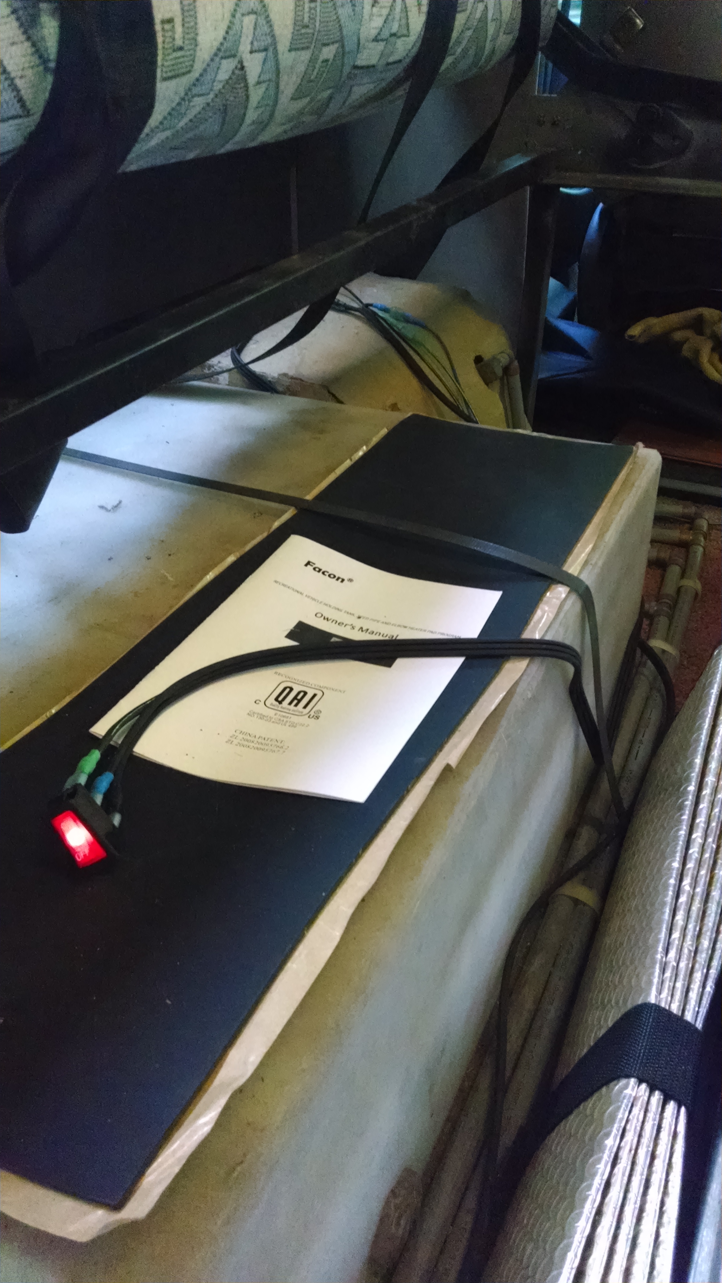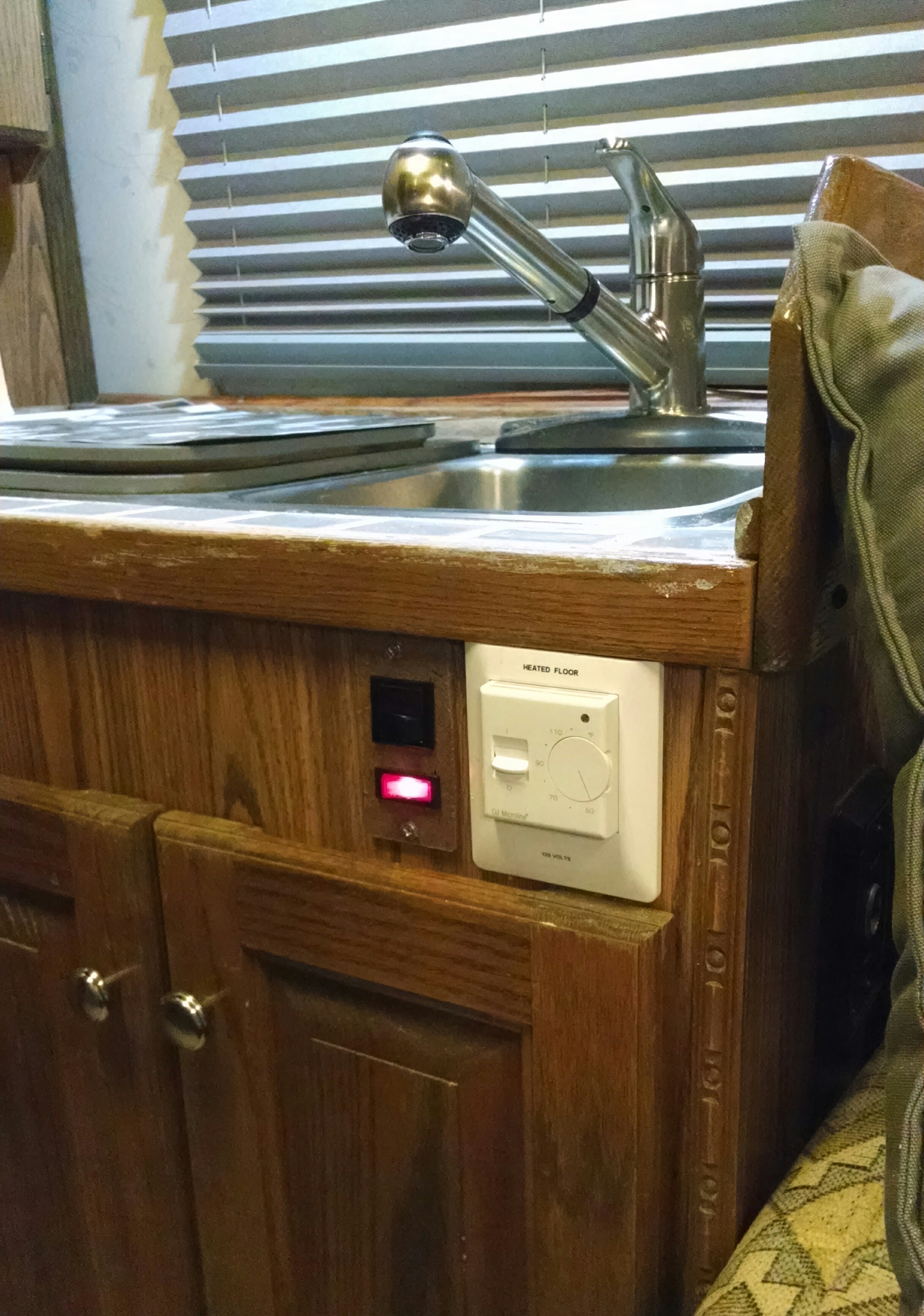 The plan (perhaps later today) is to extend the switch wires over to the outside sink cabinet next to the stock gas mode switch. And to install a 110v outlet under the sofa also on the sink cabinet, to plug in the heating element.