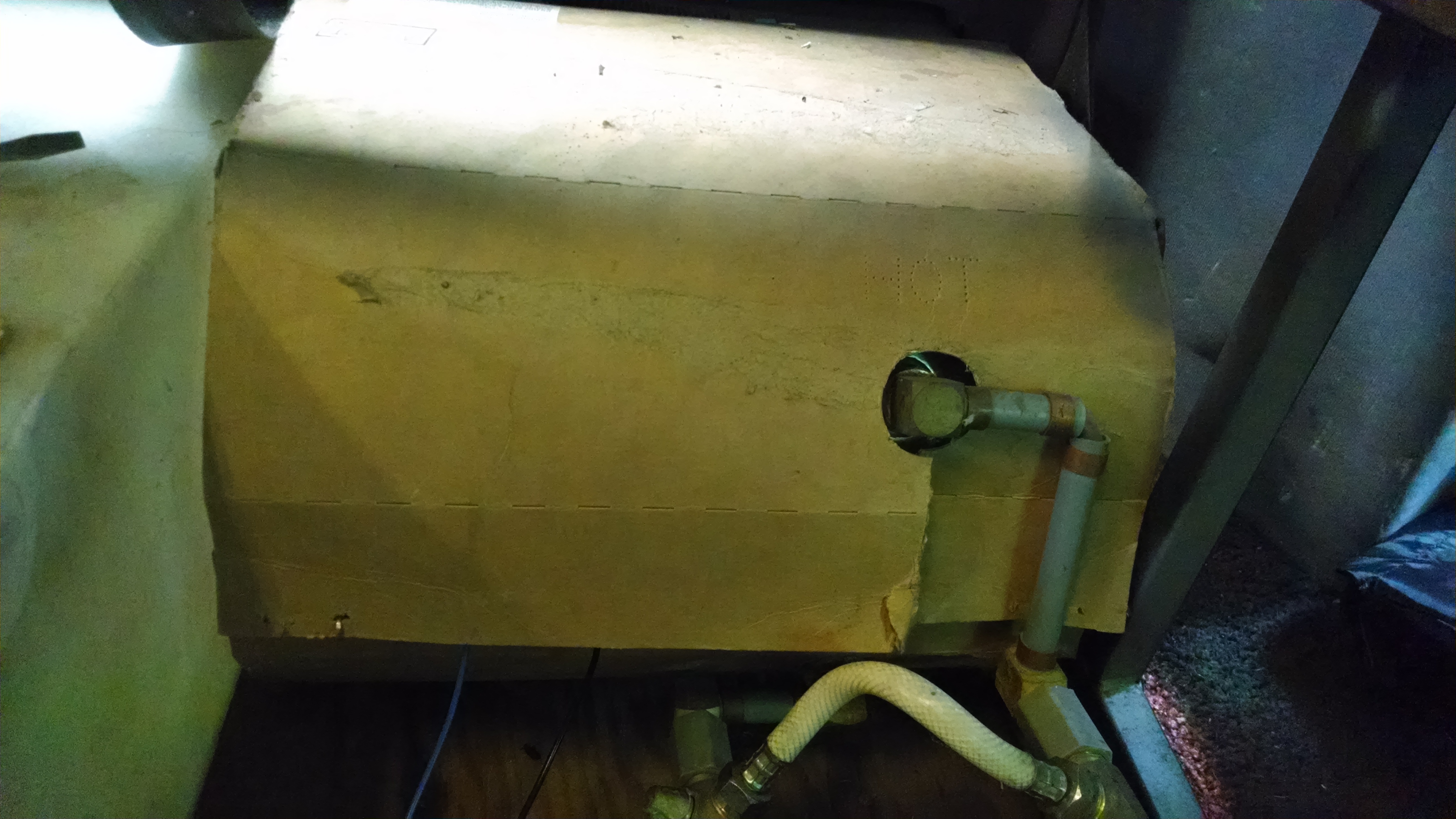 A while later... Okay, got a good start, Stuffed insulation all around the tank under its cardboard cover, and started covering the hot water hoses leaving the heating unit. I'm also going to add some insulation to the wall behind the kitchen sink around the outside water inlet box, which seems oddly bare.
