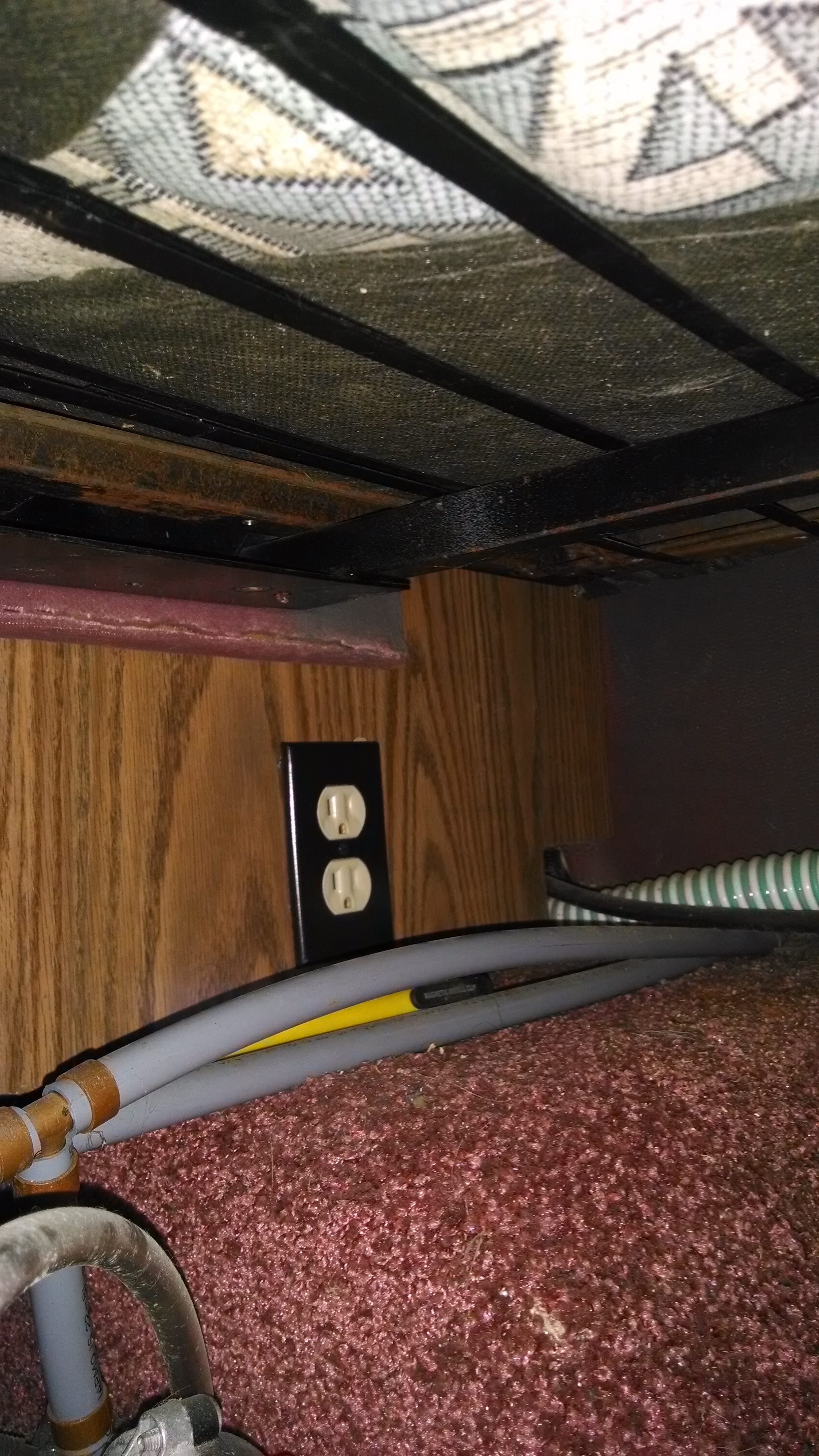 Well, durn. I didn't get the switch wires extended yet, but did manage to install a power outlet on the sink cabinet wall under the sofa just behind the water tank. I deliberately made the plugs themselves a lighter color than the cover, so they'd stand out whenever I look under the sofa.