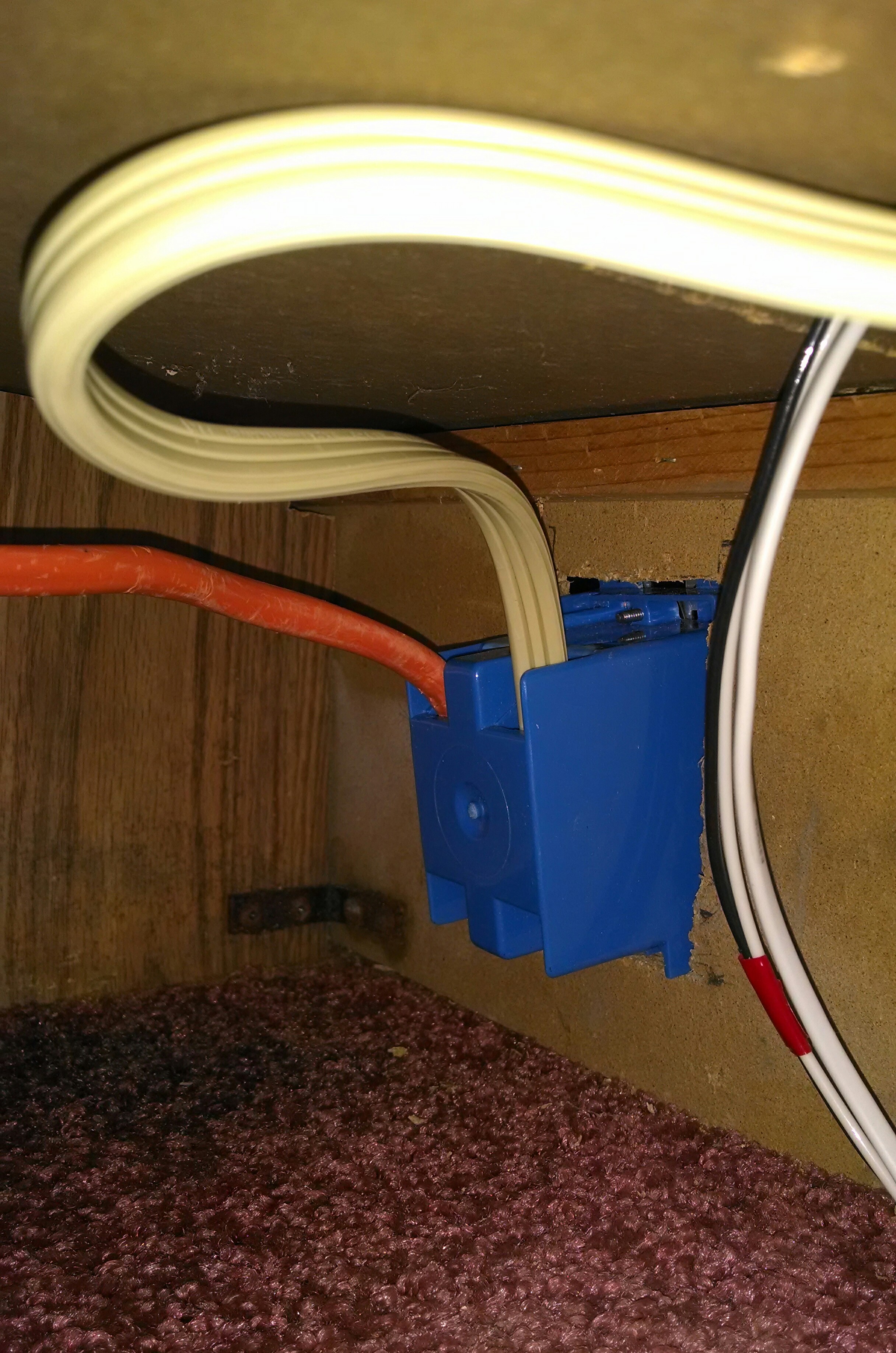A lot of my delay was figuring out how to get under the sofa (I didn't feel like taking it out again) to access the socket wire screws after running the wires into the blue box. Then I accidentally discovered that I could put everything together from under the easy sink side, then tilt the box back to slip the completed unit through the hole, and finally straighten it back upright on the other side with its attachment ears holding it in place.