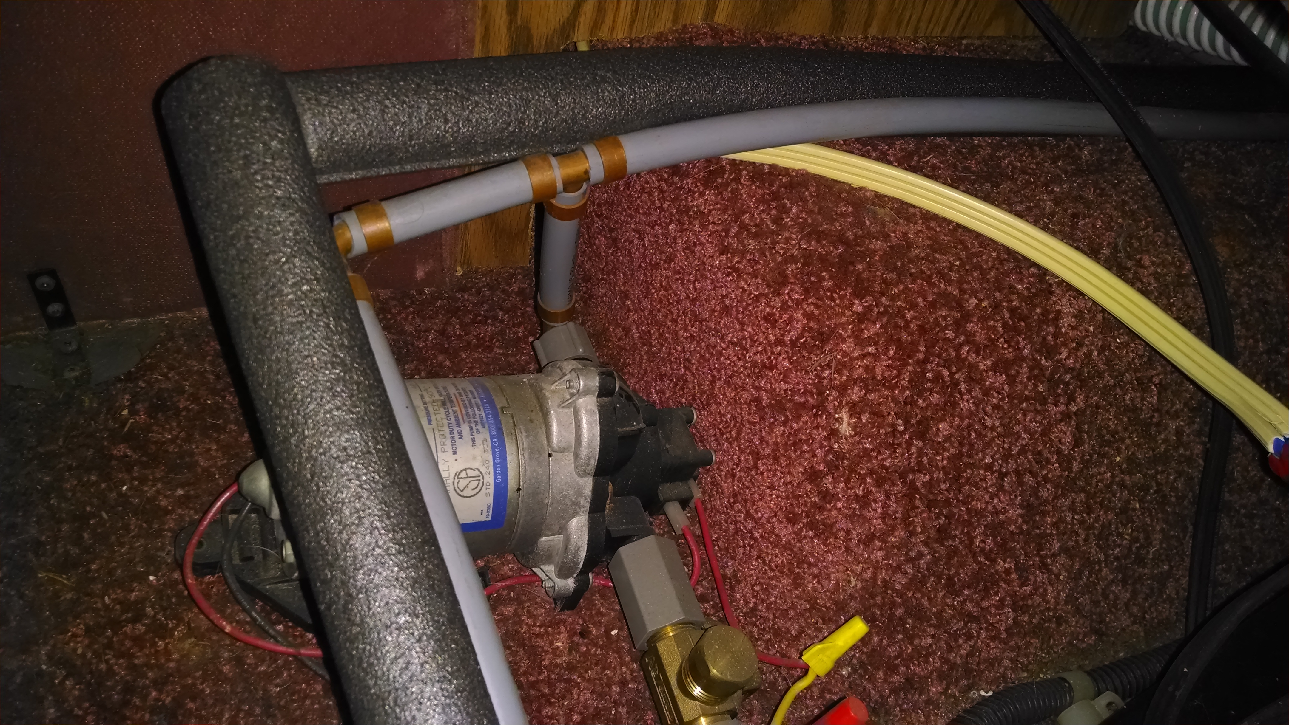 I figure the insuation roll will help the heater, and the pipe insulation will keep the water a bit hotter on its way back to the rear. Will upload a picture after I'm done. A while later... Okay, got a good start, Stuffed insulation all around the tank under its cardboard cover, and started covering the hot water hoses leaving the heating unit. I'm also going to add some insulation to the wall behind the kitchen sink around the outside water inlet box, which seems oddly bare.