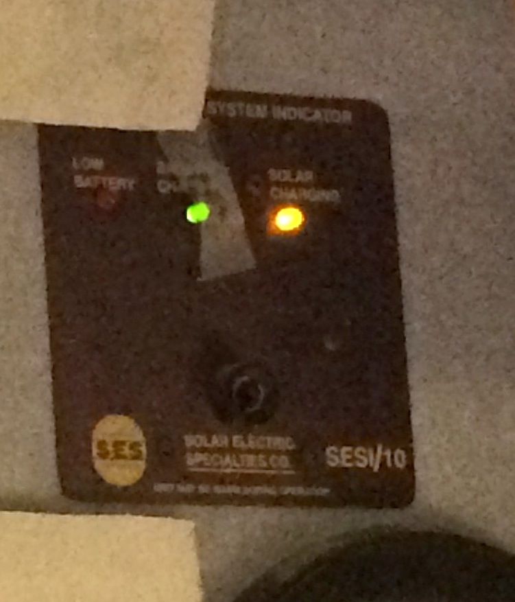 First, here is a (horrible!) photo of the controller. The "things" to the sides are because I was taping up various possibilities for new fabric on the forward fiberglass panels. But it does show the lights on. Note that I don't think both of these lights were simultaneously lit up like this "in real life." Typically either the yellow would be on (charging), or it would flicker back and forth between yellow and green (getting close), and then eventually (theoretically) go green. At any rate, both the yellow and green lights did work as you might expect. IIRC, the only reason they are both on in the photo is that at this point in time I was in the process of removing the Chinook house battery and brown box and moving the stock DC load wires over to my new system. So while the solar panel was still on the roof and hooked up, it didn't "go anywhere" anymore (until it went into my storage box :D). You can see the remnants of a piece of tape from where I had a milk jug cap taped over the green because it was too bright at night.