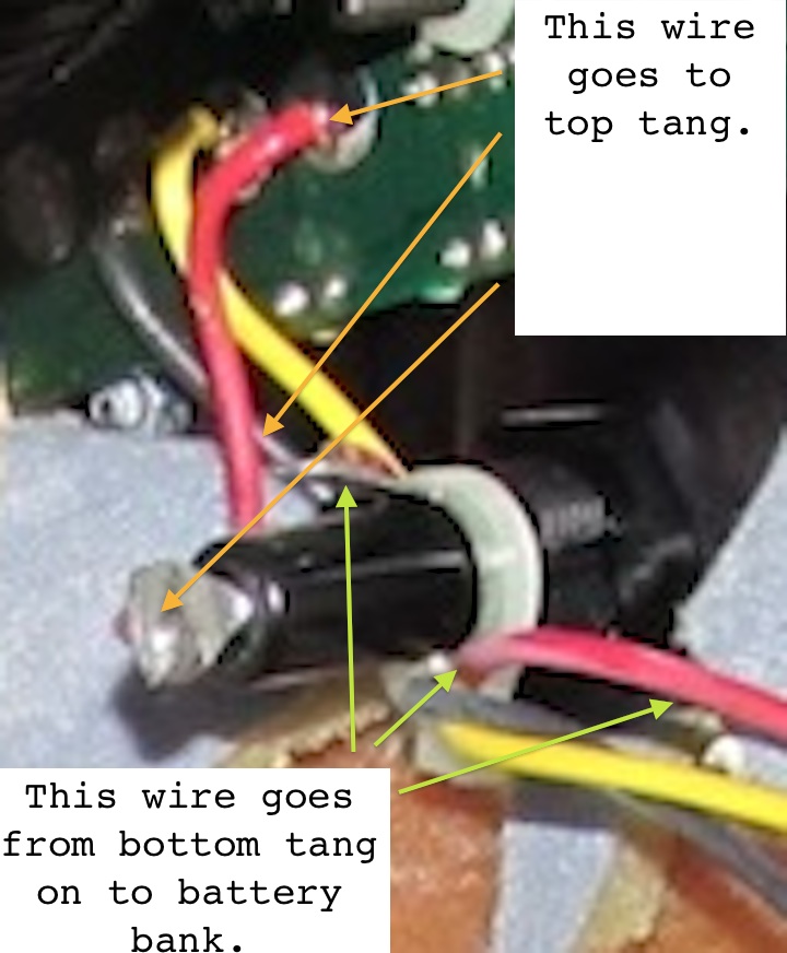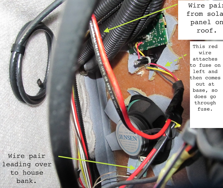 (Actually, from the photo I could only be like 95% sure which red Chinook wire was coming from panel and which was going to house bank. That 95% said yellow/roof, red/battery; but what ups that to 99.9% for me is that the outgoing wire would be the fused one. And that's the red wire. So hence red wire to battery (of course check all this on your own, blah blah).