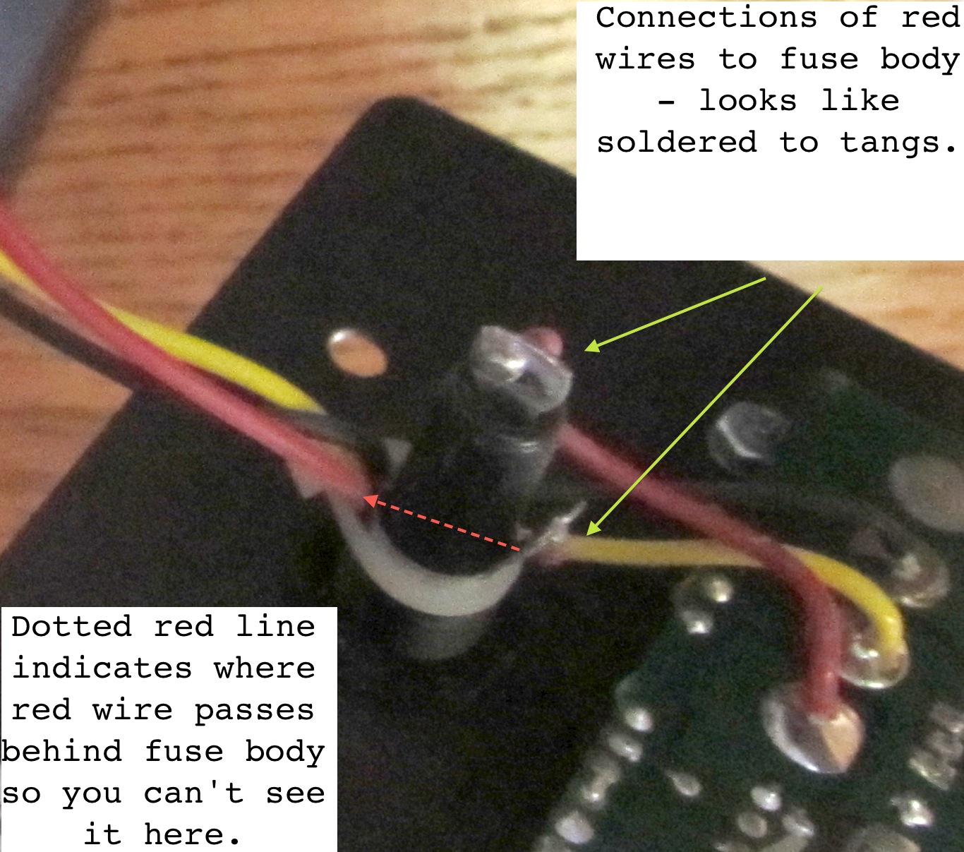 The red does go to the back of the fuse on its way "out," as you can (just, barely) see in this photo. This was taken way back, when I was just stuffing a camera in there and blindly photographing, hence why it's barely in the photo. I may have a better one, and if so I'll come back and add it (would have to find it though!).