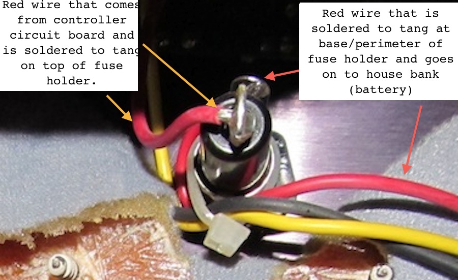 I don't know if you could see it very well (with those amazing photos :lol: ), but the red wire comes out of the circuit board on the controller and is then is soldered to a tang on the top (i.e. the most sticky-outy part) of the fuse holder. Then another red wire is soldered to a tang at the base of the fuse holder (then wraps around the back of the fuse holder where you can't see it in the photo), and that's the one that goes on to connect with the Chinook red wire to the battery bank. Here are a few more photos.