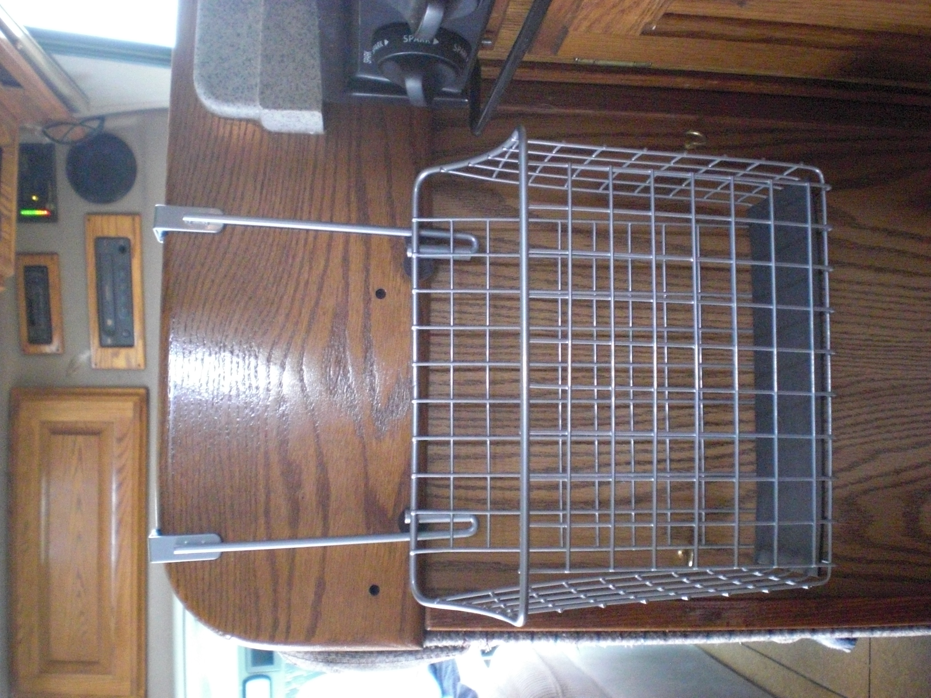This hanging wire basket lined with a grocery bag makes a good galley wastebasket. It stays in place with velcro under the hanger tops and is out of dog nose range. It does stop one under-stove cabinet door from fully opening, but that hasn't been a problem. Don't have the tag anymore so don't know the manufacturer but found several similar online. And the photo refuses to load upright