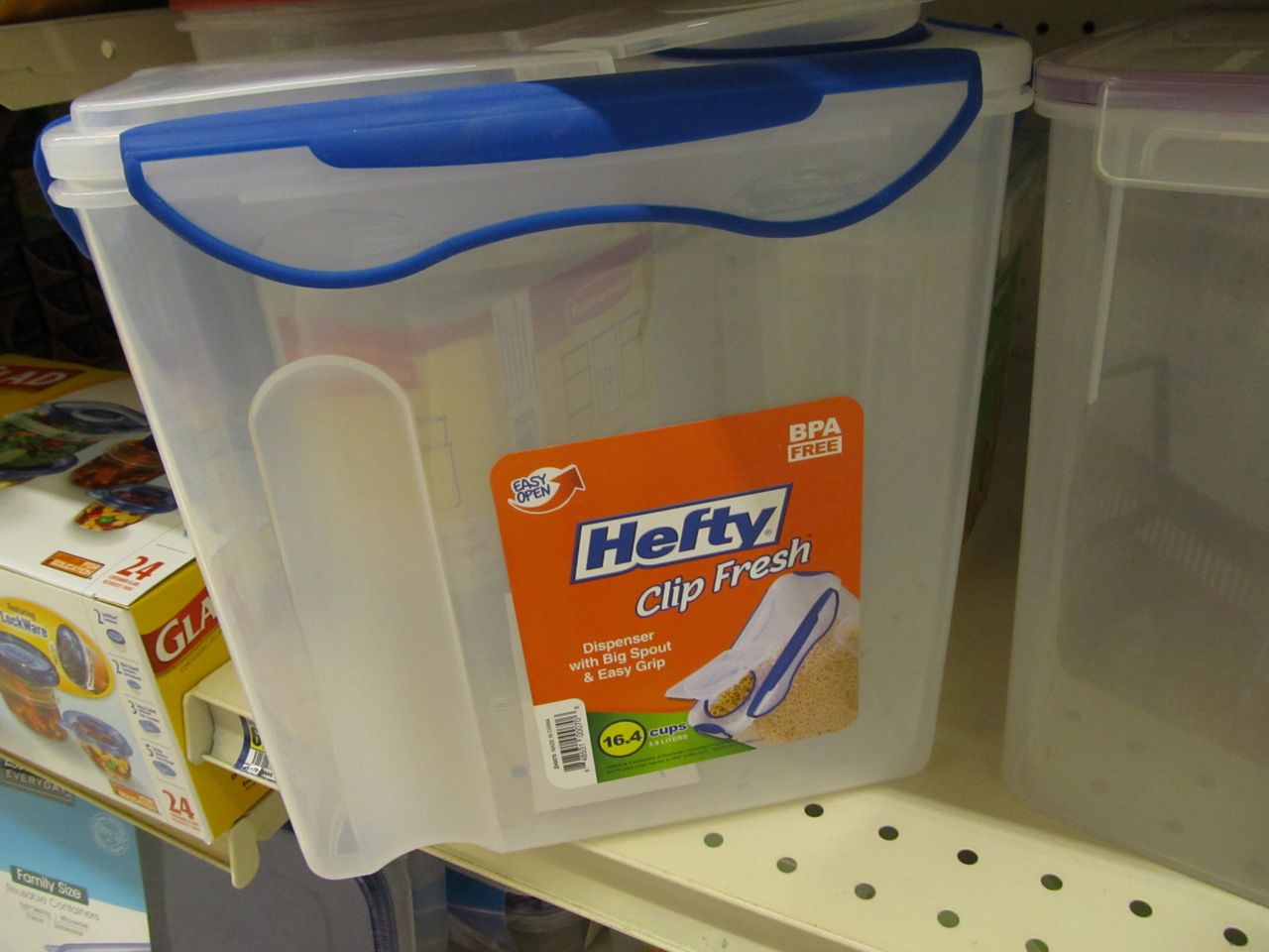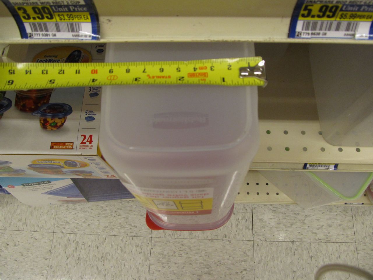 Next up was the bathroom. Good luck finding any trash receptacle to fit in that "room"! Time to think outside the box. I went to the "Tupperware" department armed with a tape measure and started measuring the thin, tall dispenser/canisters (meant for cereal or the like). I now use one of them in the bathroom (sans lid) as a wastebasket. Believe it or not, it fits between the side of the toilet and the sink (outboard of the toilet footpedal). After measuring these I found an even skinnier one (no photo), but this gives the idea.