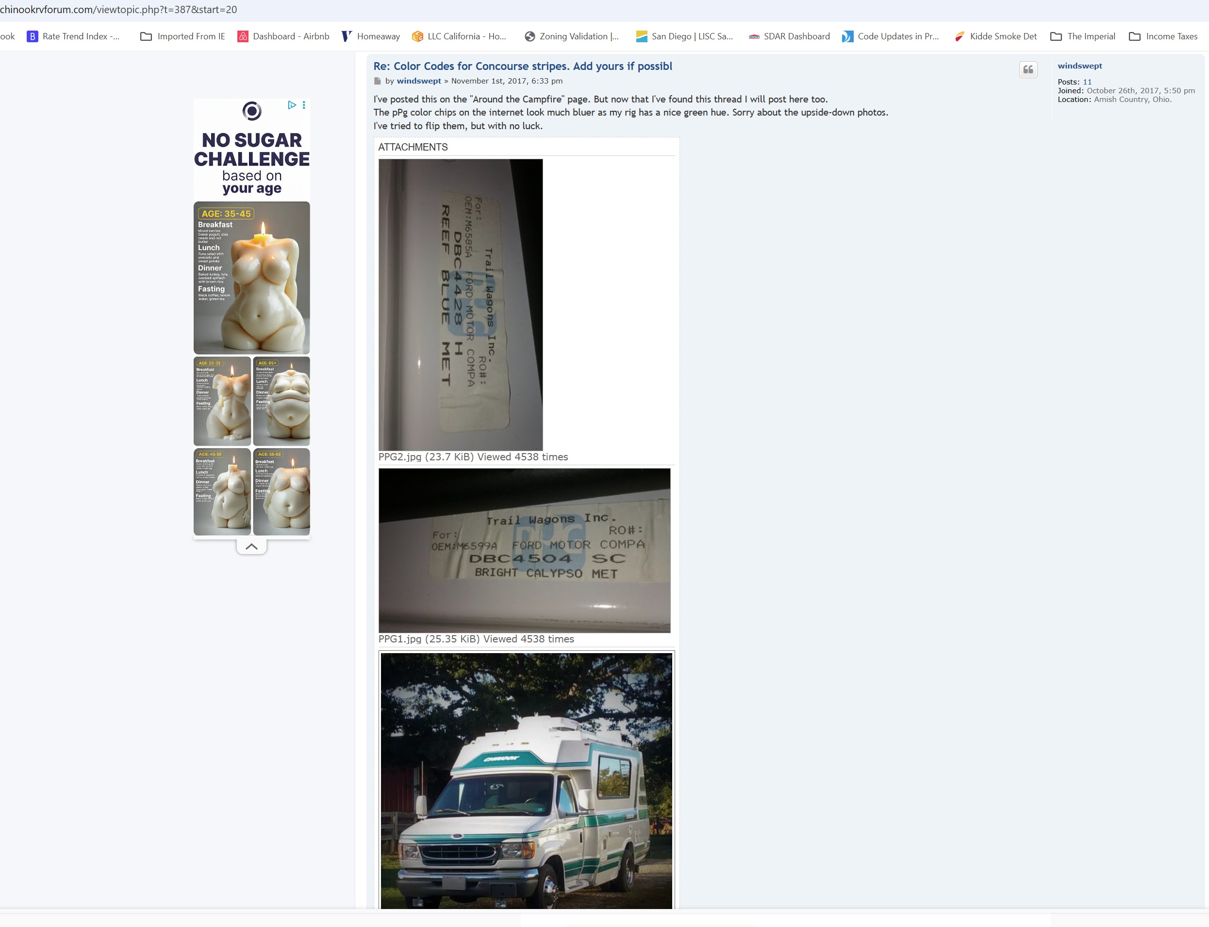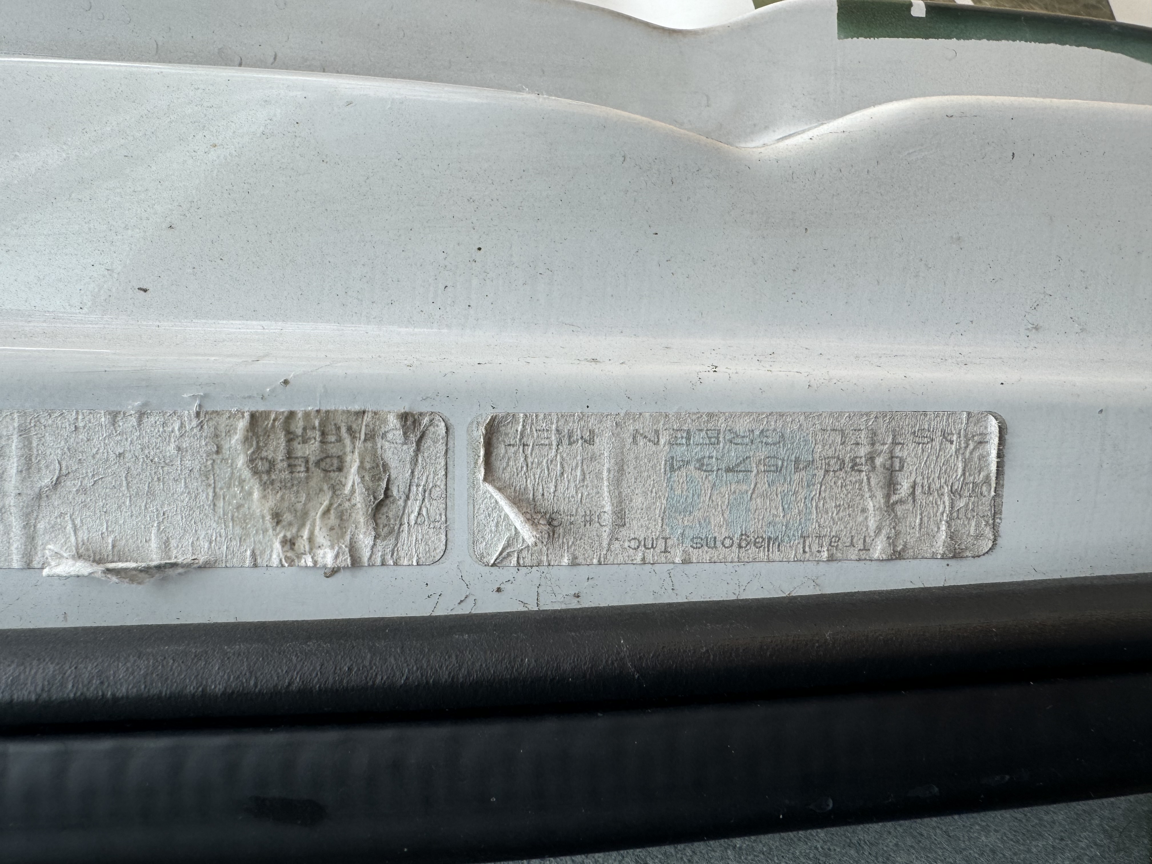 I have a 2000 Chinook Concourse in the green color. Does anyone have legible color code stickers for this color? One of my stickers is legible and says "Pastel Green Mist. DBC45734". The second sticker only has the first work visible "Dark". It's very similar but must be different from the Teal color that people say sometimes looks blue, because I saw someone else's post showing stickers that say "Reef Blue Met" and Bright Calypso Met". Here is a picture of the other posting which looks like the same color as mine, but shows different color code labels and a picture of my chinook and my barely legible color labels...