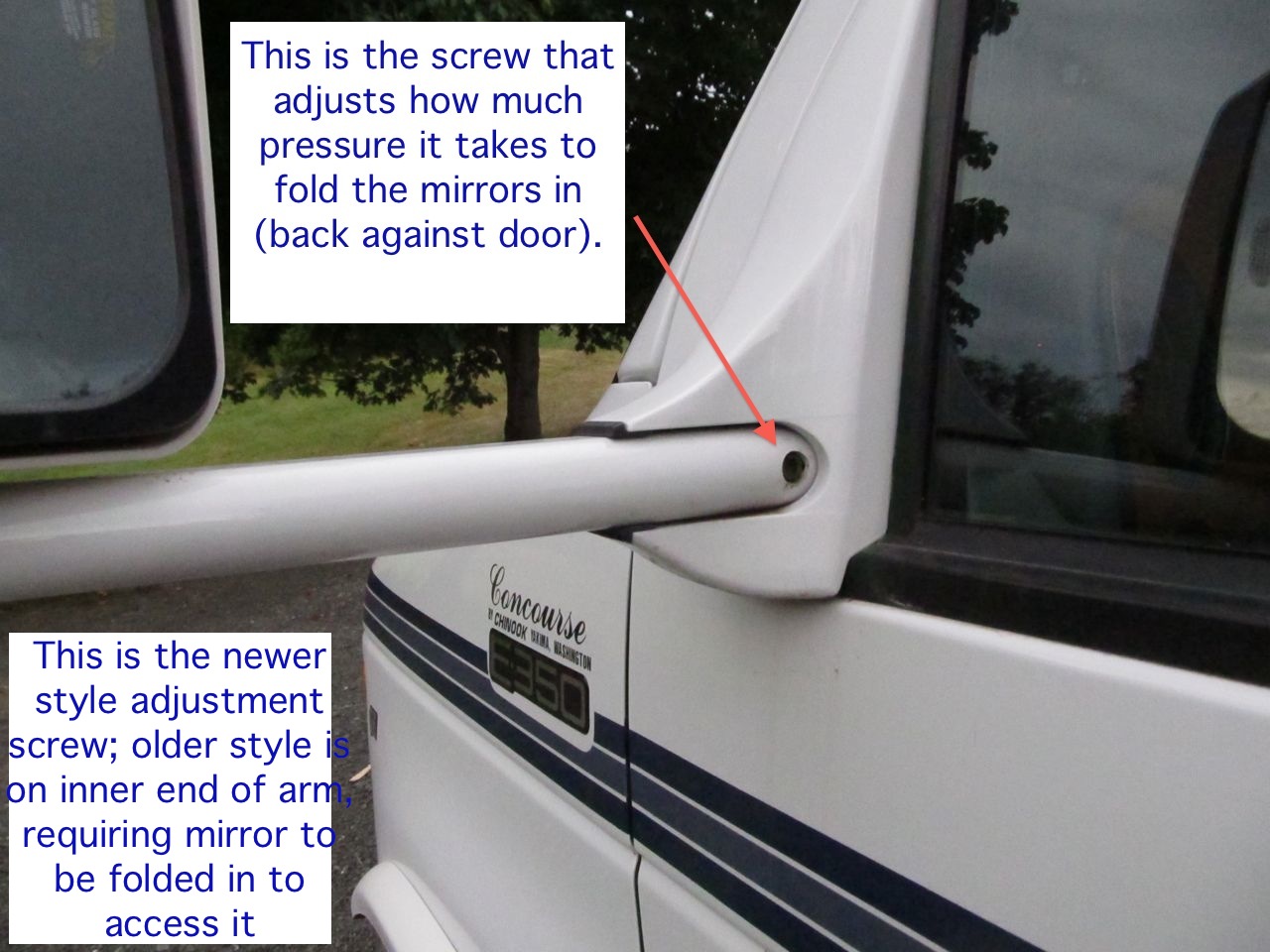 To adjust the arm folding tension, there is an allen screw near the end of the long arm where the arm meets the van body. The exact location of the screw was changed around 1997. I asked for a description of both just in case Chinook had a stock of older mirrors lying around when my 1999 was built (as it turns out, I have the newer style).