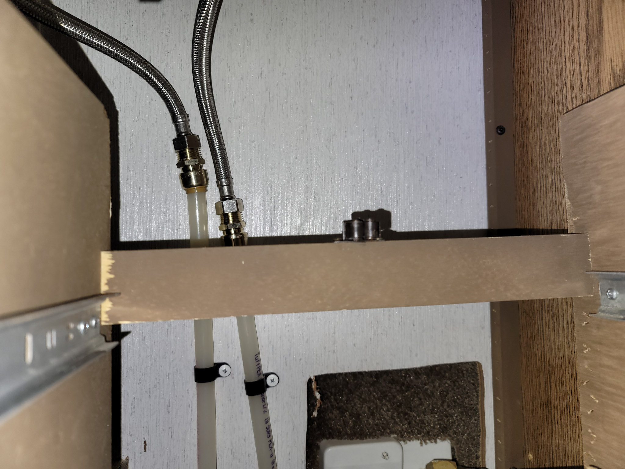 Since no project can be completed without at least one extra trip to the hardware store, I went back and got 12" x 1/2" faucet supply hoses - the braided metal kind, and a couple of push-to-connect 1/2" MNPT adapters, along with a PEX pipe cutter. It really was a very simple job, just awkward. Attach the adapter to one end of the supply line, screw the other end to the faucet stem, cut the PEX line, and shove the push fitting onto the end of the PEX. I'm not sure I had enough leverage to make a really solid seal that would hold up to city water pressure, but I didn't have any drips when I turned on my water pump, with or without the tap running, so I'm cautiously optimistic that I won't have to go back for crimps and such.