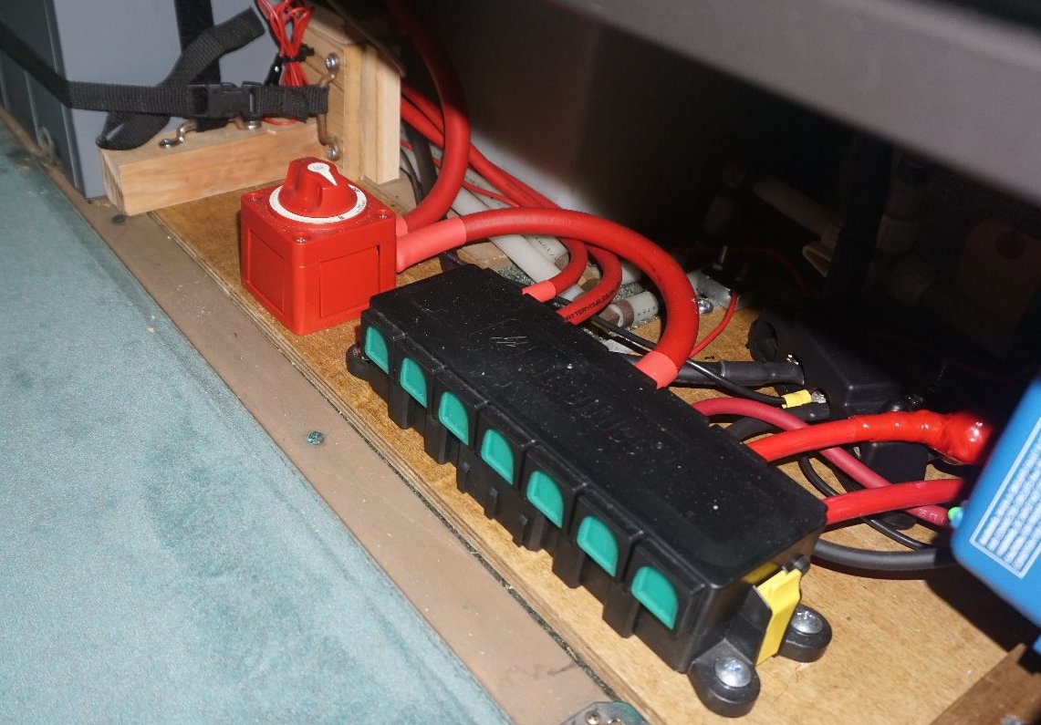 Here is the forward side showing the batteries and the fuse holder in a handy spot to replace a fuse if I have to - hopefully not! The on/off switch here turns everything off - no voltage in or out, so I can work on any thing and not get shocked or spark something:
