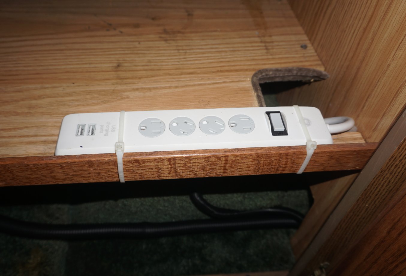 Because we won't be using the inverter unless we are not on shore power or should not/cannot run the generator, the quick way to access it was to plug in a surge protector that also has usb ports. I installed that on the shelf underneath the kitchen sinks: