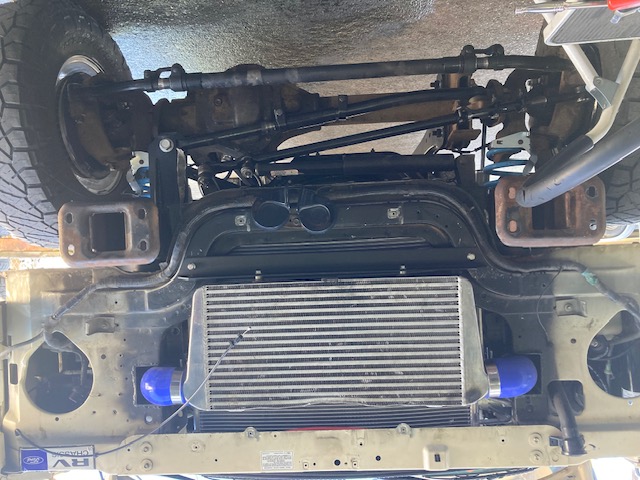 got the front end on and just need to hook up the tail lights, i will have the rear springs re-arched to match the front height monday. one picture of the intercooler mount, it was a task to get the hood release to work with the intercooler and grill but finally got it to work