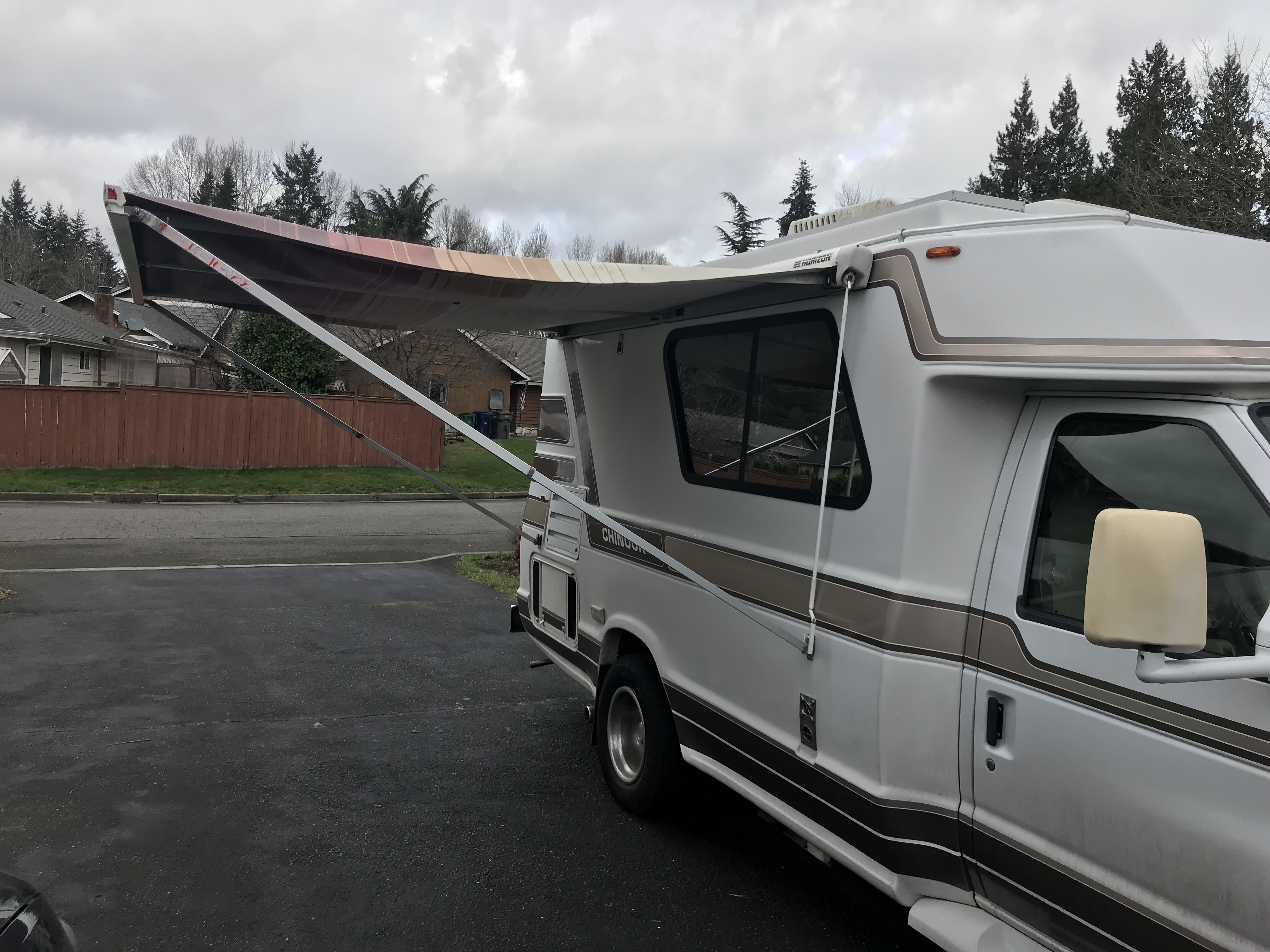 I cranked the awning out until the crank ratcheted but the arms didn’t go any further, so they stayed under extended. And that’s why it looks flimsy and saggy, not tight.