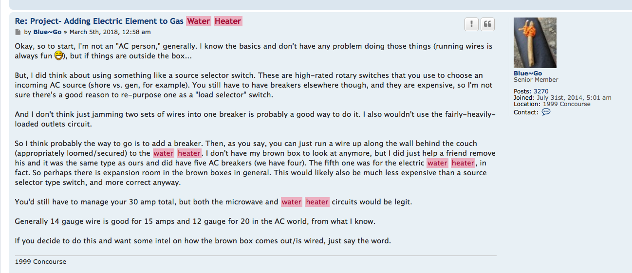So back to my original plan... upgrade to a new Suburban SW6DE (elec/lp combo) for about $330. Direct fit with the option of heating with shore power electric. Per a topic a while back, Blue~Go suggested adding a fifth breaker to the brown box dedicated to the SW6DE. Since we only have 30 amp total service, I will need to select my use between the microwave or WH so as not to overload. I will be able to install proper wiring when the couch is removed for the "Dano Twin Bed Mod". The water heater and furnace are 18 years old on my rig, too. We usually use a Lasko ceramic electric heater to get toasty. Can't remember the last time we used the Lp furnace...hmmm, maybe more storage space?