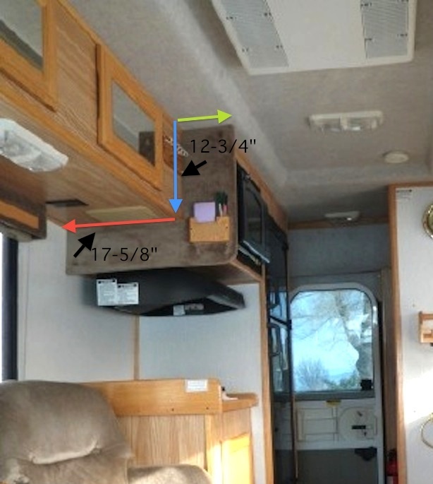 A note is that compared to the Concourse cabinets, the Premier ones over the dinette and couch don't just "cut straight up" where the Concourse ones angle. Rather, the Premier ones come out from the wall around another 1-3/8" or so and then cut up. So they sort of split the difference (although the Concourse ones are still another 3-3/4" or so out at the top)
