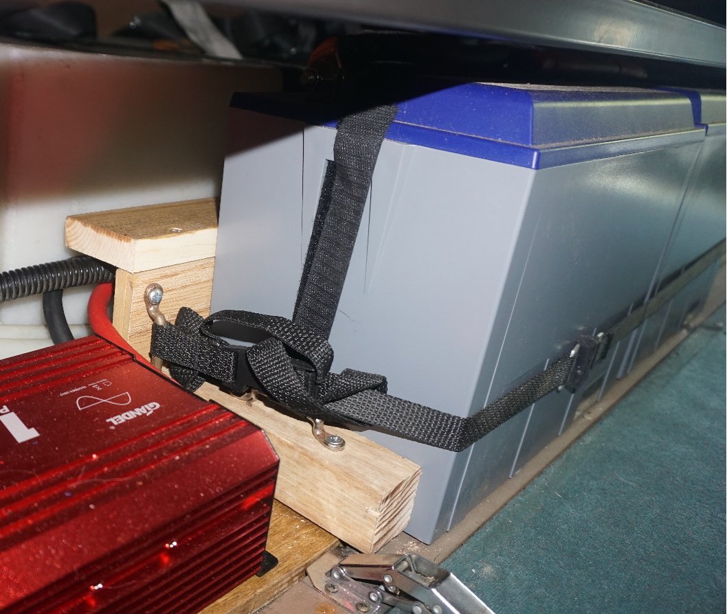 These photos show how everything fits tidy underneath and are reachable. One thing I should mention is that I had to search for an inverter that would fit on the aft portion of the couch. I could not be more than 6 inches wide or more than 11 1/2 inches long. The Giandel 1200 Watt Inverter fits perfectly being that it is 5.5 inches wide and 11.2 inches long. Also the batteries, of course, must fit and they do rather nicely. They are wider at the top than the bottom, so they fit flush to the drop down panel at the top, but there is little gap at the bottom.