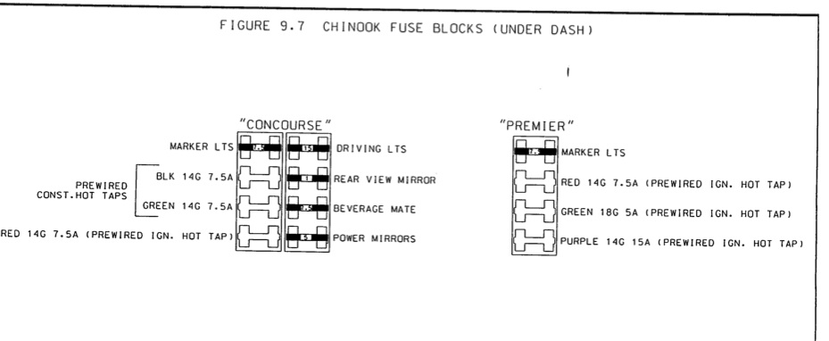 Here is a diagram (from year 2000 manual), but my 1999 is basically the same) that shows the Chinook added fuse blocks. Since your Premier has a Beverage Mate (which was not "normal" on a Premier but I think they may have done custom options for original owners) the block might be the larger Concourse one. Or I suppose it's possible that someone put in the Beverage Mate for an "upgrade" but never wired it in (?!).