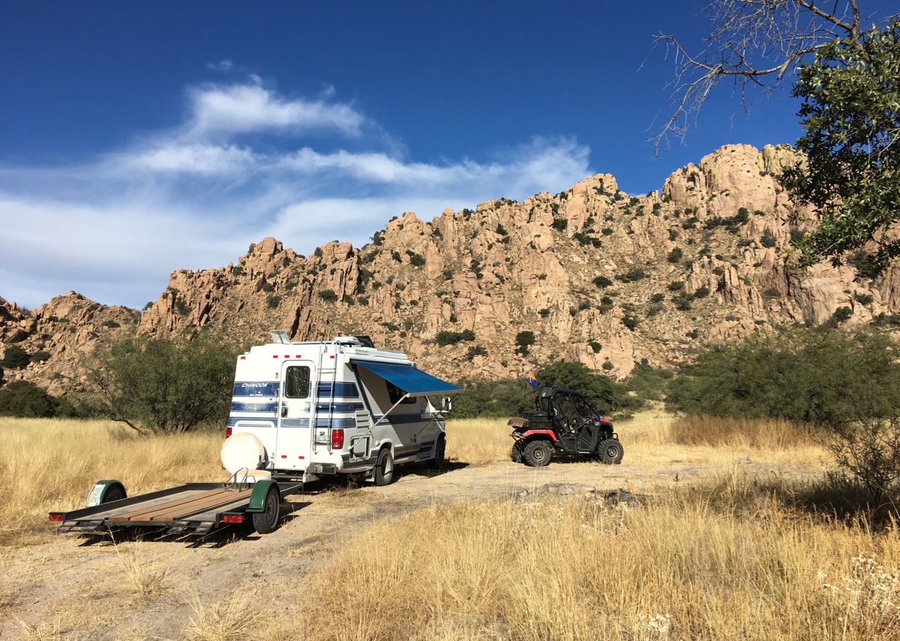 We escaped the area in our ATV on some old mining roads into the mountains to find the route to the summit of Apache Peak. This is a notorious 4WD trail along a narrow shelf road with no turn around spots. Extreme terrain quite unsuitable for the Chinook!