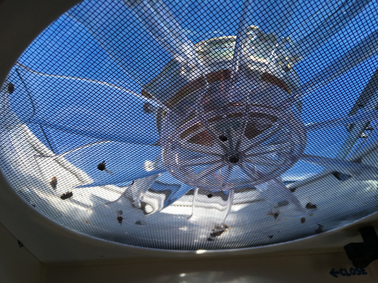 The bee bits became glued to the fan by their excretions and presented a hazardous waste clean up. I foolishly removed the bottom screen in the cool of early morning to brush off the remains but got stung on still active body parts. Researchers claim 500 stings are equal to one rattlesnake bite in toxicity. We are always cautious about startling usually defensive rattlesnakes but these bees ramp things up to a much higher level of relentless aggression.